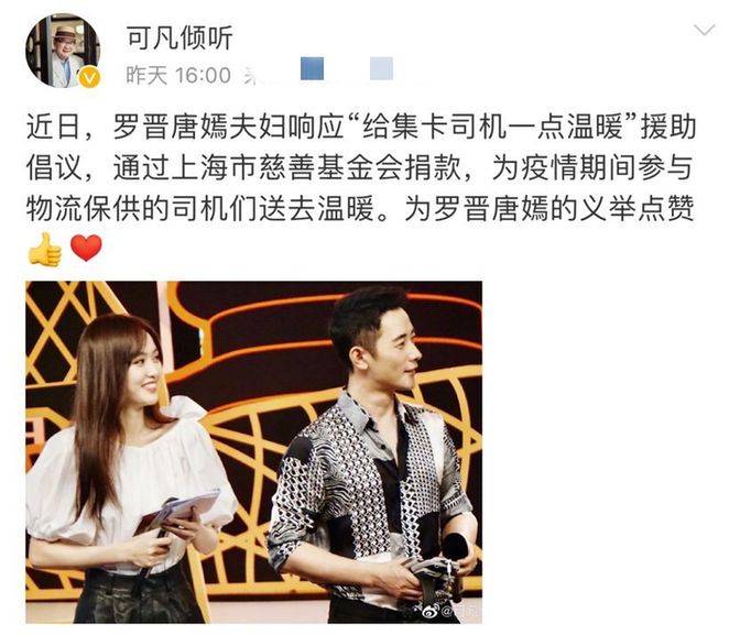 上海热线综合,近日,主持人曹可凡在个人社交平台发文称罗晋唐嫣夫妇在近日响应“给集卡司机一点温暖”援助倡议,通过上海市慈善基金会捐款,为疫情期间参与物流保供的司机们送去温暖。