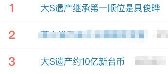 2月10日,微博话题#大S遗产继承第一顺位是具俊晔##大S遗产约10亿新台币#等登上热搜,引发网友讨论。